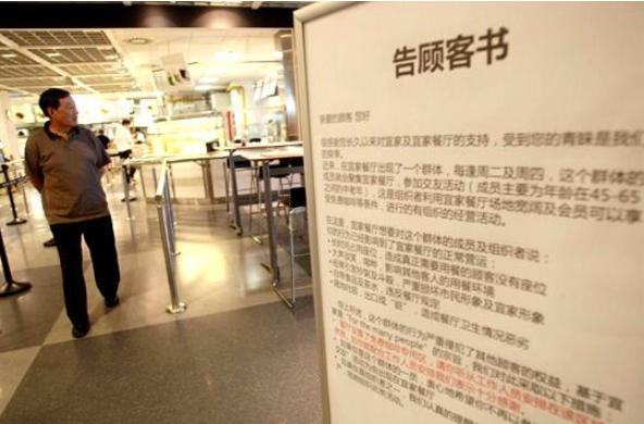 上海徐家匯宜家商場的管理方,在長達10多年的管理過程,一直都想清理這個老年人相親會場,無奈在與老年單身朋友的斗爭過程,一直處理落敗狀態(tài),盡管管理方設置最低的消費門檻、先消費后入座模式,也沒有能阻擋住上海相親的老年人進入,這個老年人相親會場一直火爆至今,形成上海一道獨特的風景線。