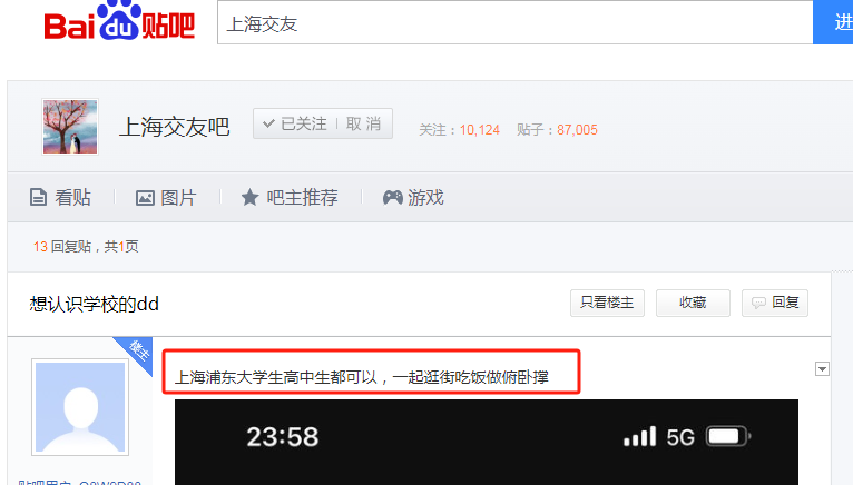 這在貼吧交友顯得非常重要,只需要點擊查看一下發貼的ID,看看對方的發貼歷史,就大概知道對方是干什么的了,諸如:婚介業務員,約炮招嫖者等,都會隱藏其中,很容易分辨。如下面這個發貼ID的內容,初一看是招嫖信息,再看發貼歷史,涵蓋了:北京、深圳、